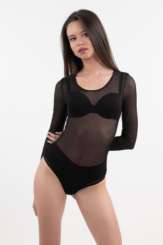 10Б Дамско боди с дълъг ръкав и обло деколте тип прашка, тюл.