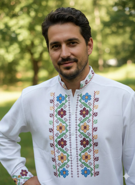 Мъжка бяла тениска с яка и пиринска шевица - бродирана