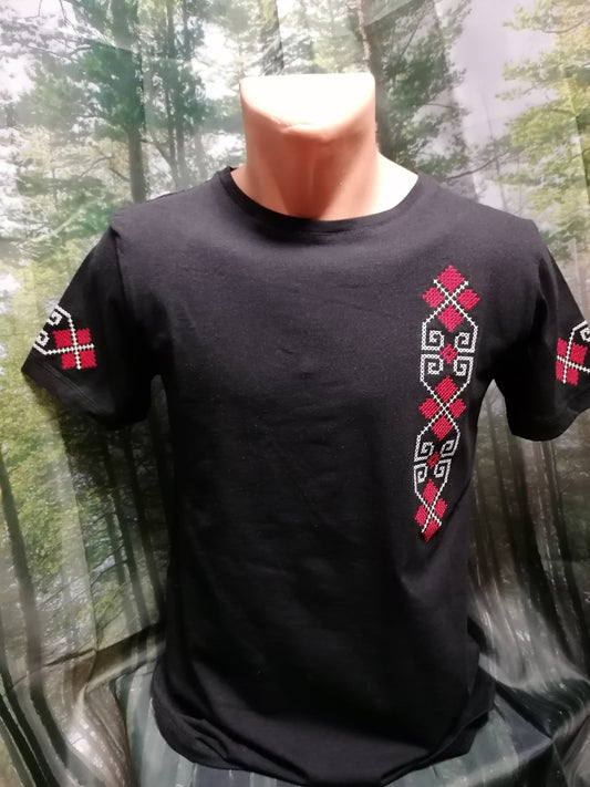 Мъжка черна тениска с яка и пиринска шевица - бродирана