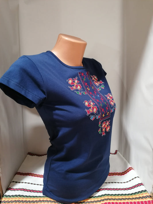 Мъжка черна тениска с яка и пиринска шевица - бродирана