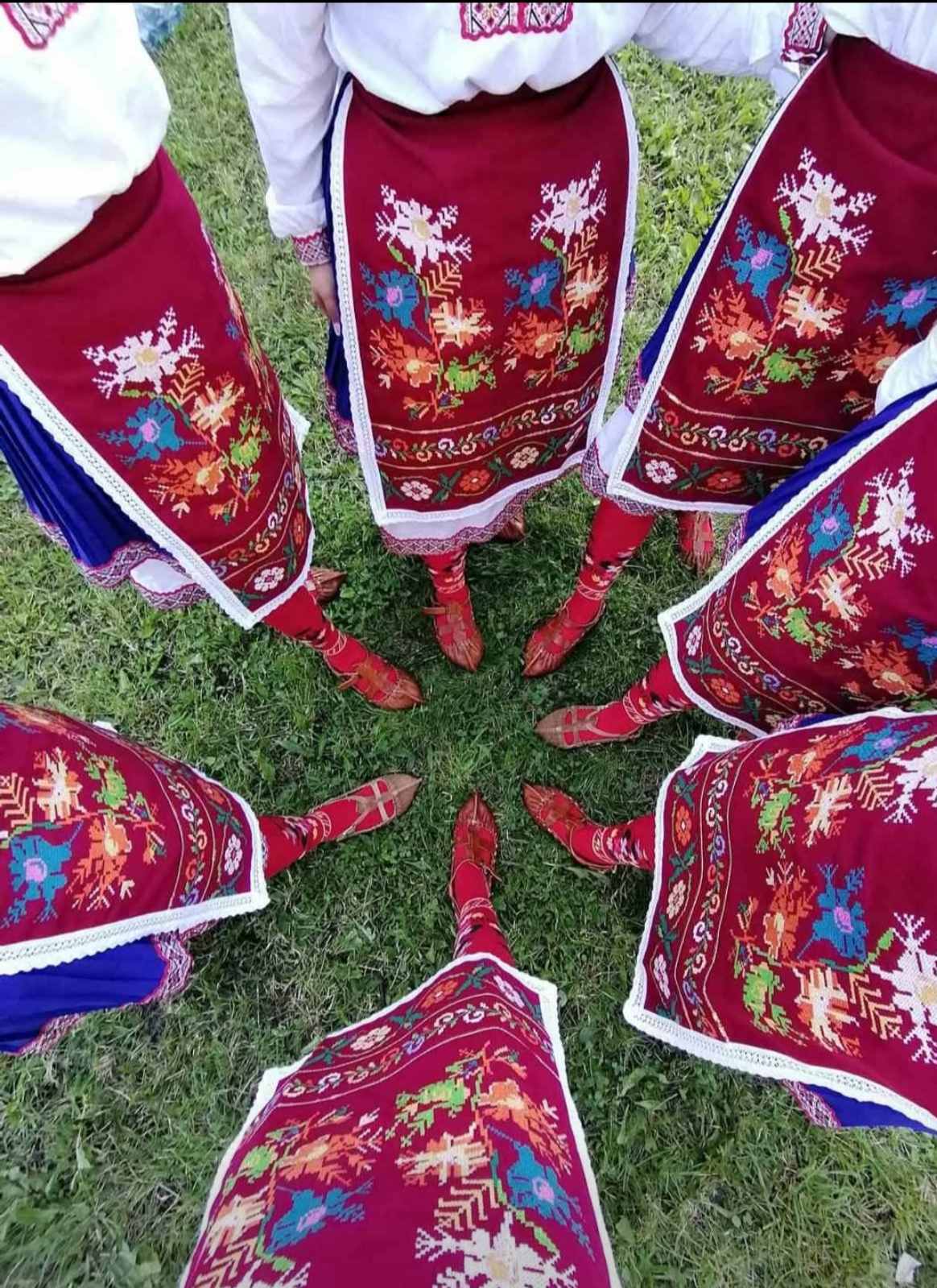 Women's red apron, made of woolen fabric and embroidered with woolen threads; richly decorated with Thracian floral motifs; 2 rows of gold braid are sewn to the bottom of the apron; white cotton lace finishes the edge of the apron; it is tied at the waist with hand-woven cotton ribbons.