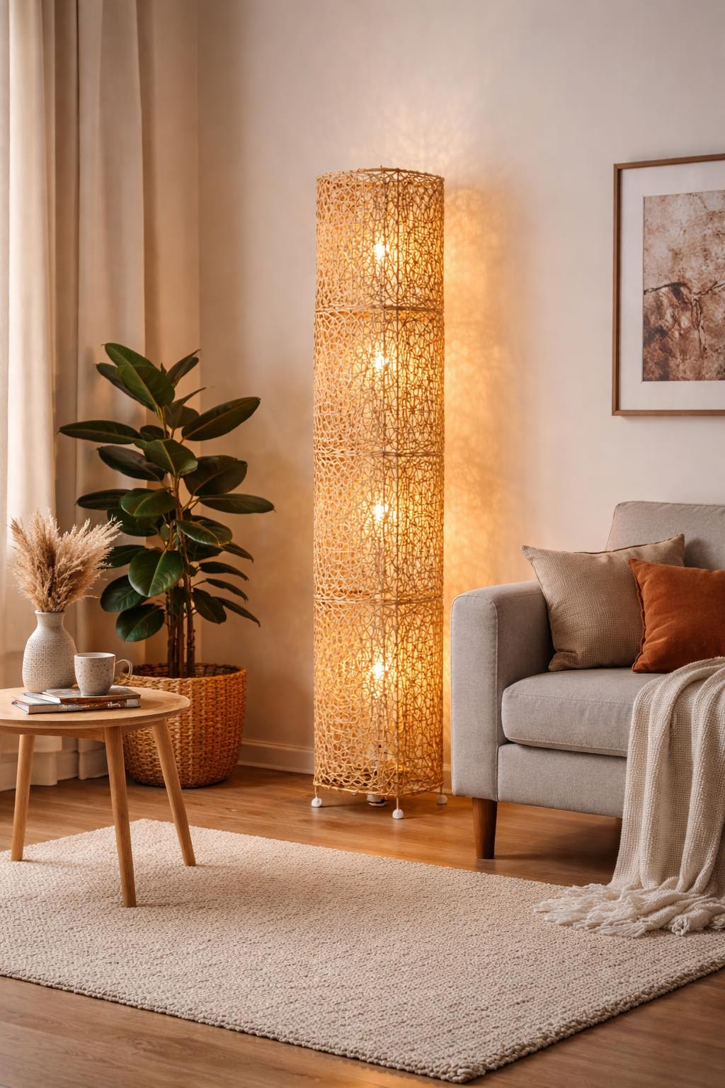 Елегантна подова лампа с ръчно изработен абажур от ратан, която създава топла и релаксираща атмосфера в спалнята. Естествената плетка пропуска светлината меко и образува красиви сенки по стените, придавайки уют и стил на интериора. Подходяща е за поставяне до легло, нощно шкафче или в ъгъл на стаята като декоративен акцент. Подходящ за вътрешно обзавеждане на холове, спални или офиси, създавайки уютна атмосфера чрез пречупване на светлината през оплетката.
