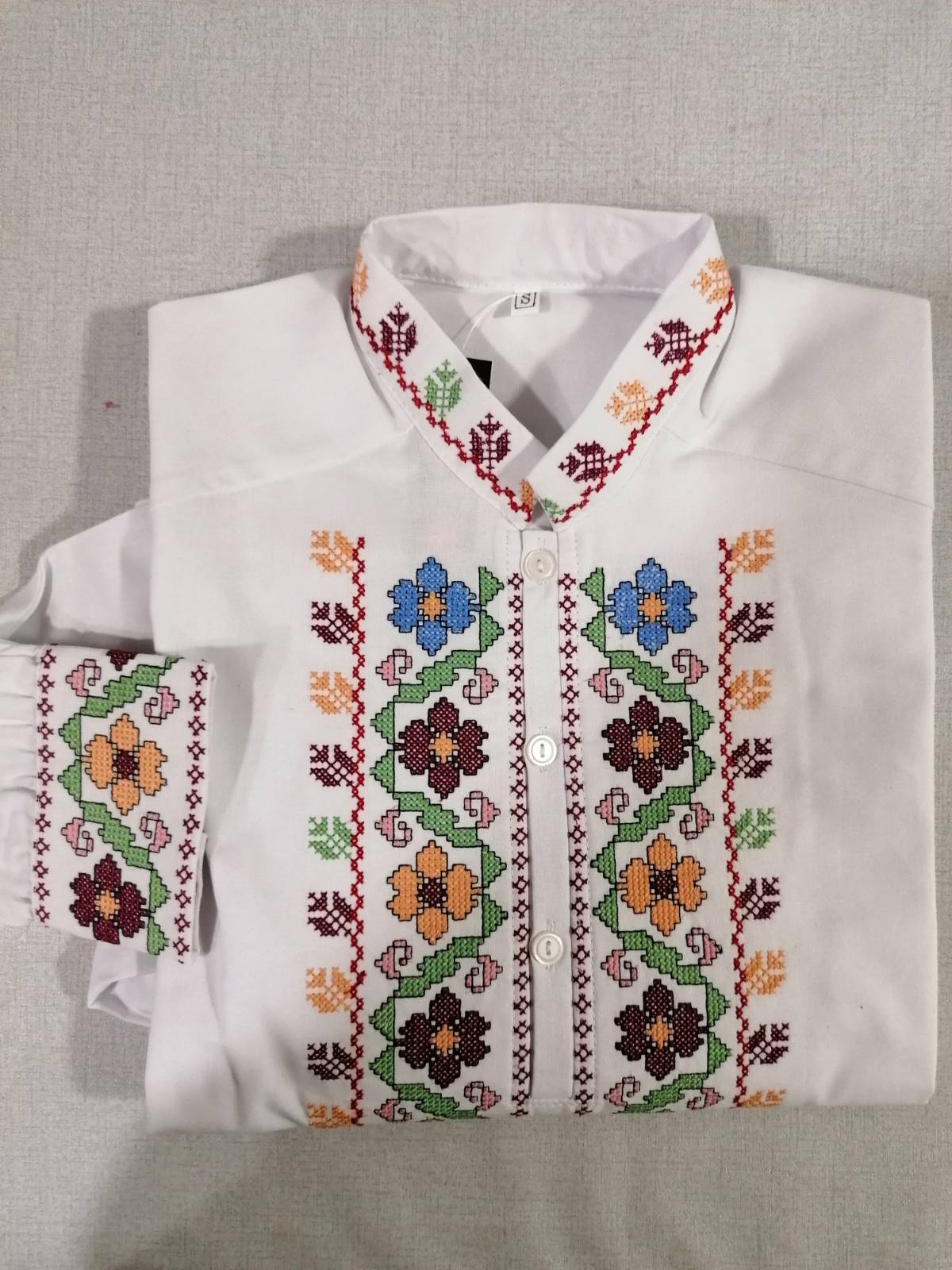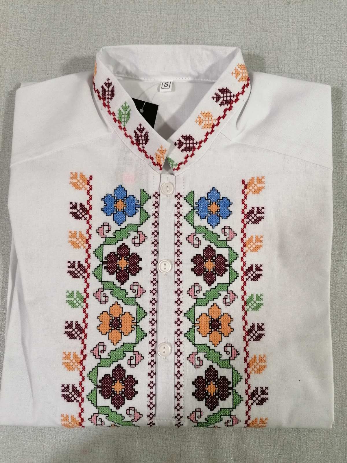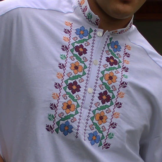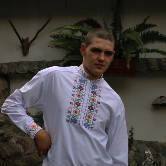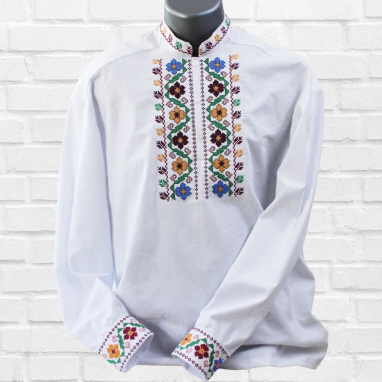 Мъжка бяла памучна риза с дълъг ръкав, завършващ с бродиран маншет. Пъстроцветна автентична шевица краси предната част около  деколтето и маншетите .
