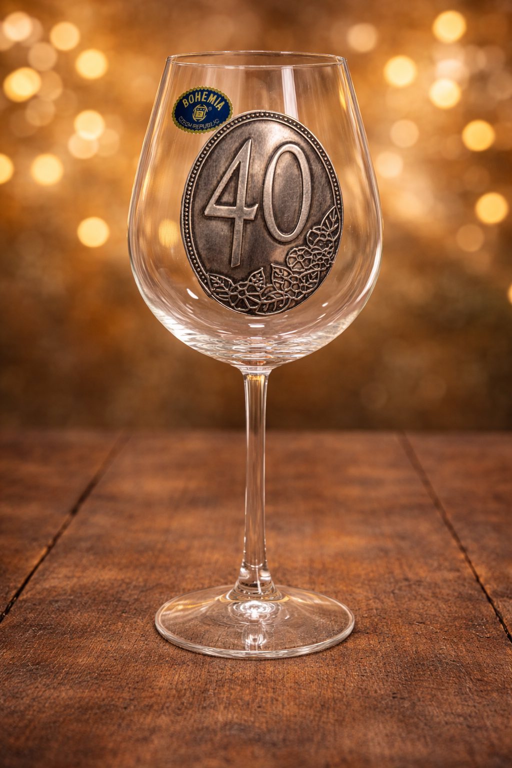 Юбилейна чаша за червено вино, предназначена за отбелязване на 40 годишнина. Изработена е от стъкло и е декорирана с овална метална плочка (оловен кристал или калай), на която е гравирано числото и флорални орнаменти.Височината на чашата е приблизително 22-22.5 см, а вместимостта обикновено е между 450 мл и 650 мл. Цената е за 1 бр.
