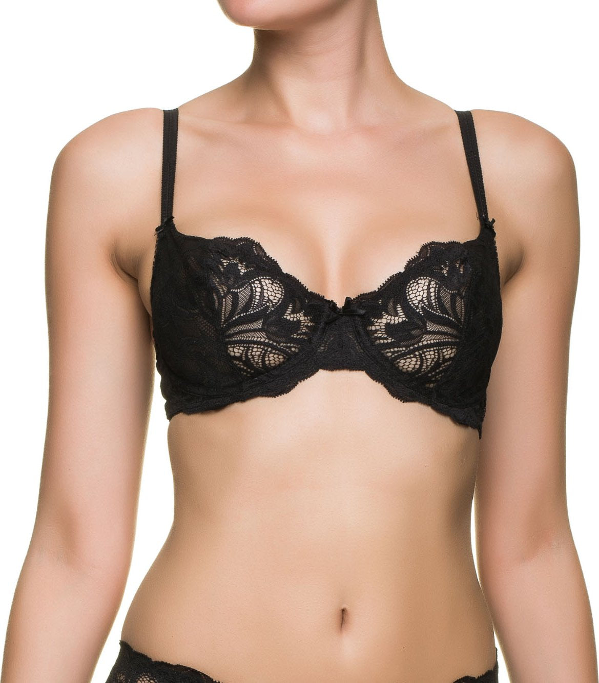 Amourette 28 W Много популярен сутиен с банели Triumph, изцяло без подплънки. Еластична дантела с флорален мотив. Центърът между чашките е украсен с нежна панделка. Перфектно прилепнала кройка тип „балконет“, подходяща дори за по-дълбоки деколтета. При нашия модел чашката е изцяло дантела. От вътрешната страна няма пърче. Сътиен с дантела и банел на Триумф.