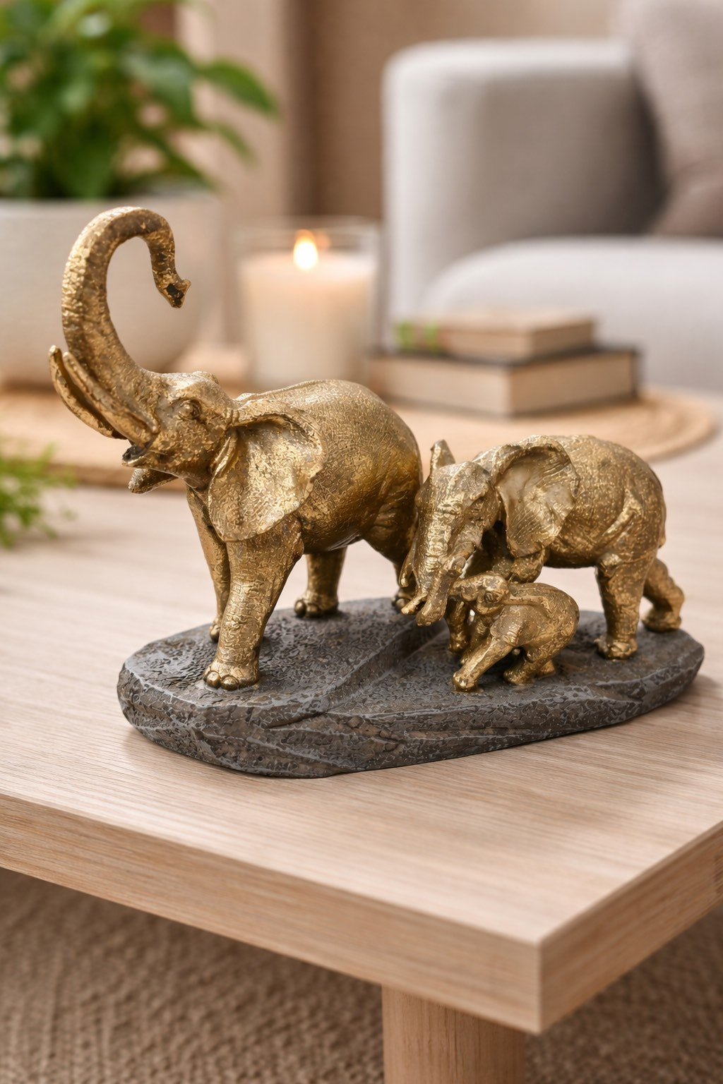 Елегантна декоративна фигура, изобразяваща семейство слонове – символ на хармония, закрила, стабилност и късмет. Изпълнена в изискан златен нюанс с фина текстура, която подчертава детайла и придава луксозно излъчване. Подарък за офис. Сувенир от полирезин. Подарък за юбилей