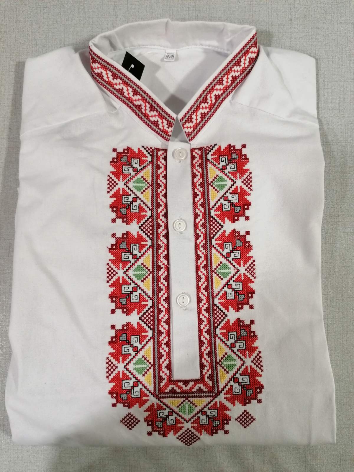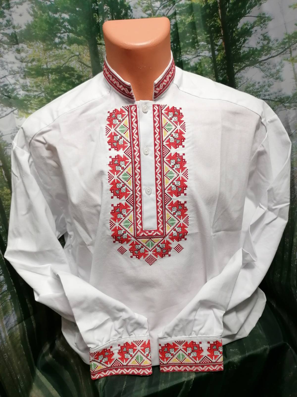 Мъжка бяла памучна риза с дълъг ръкав, завършващ с бродиран маншет. Пъстроцветна автентична шевица краси предната част около деколтето и маншетите .
