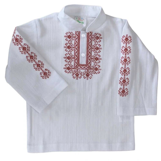 Детска риза с бродерия, изработенa от висококачествен 100 % памучен кенар, осигуряващ нежен и приятен допир до тялото. Добавената българска шевица придава не само модерна и актуална визия, но и спомага да съхраним българските традиции. Може да се носи както самостоятелно, така и като част от народна носия. При въпроси не се колебайте да се свържете с нас