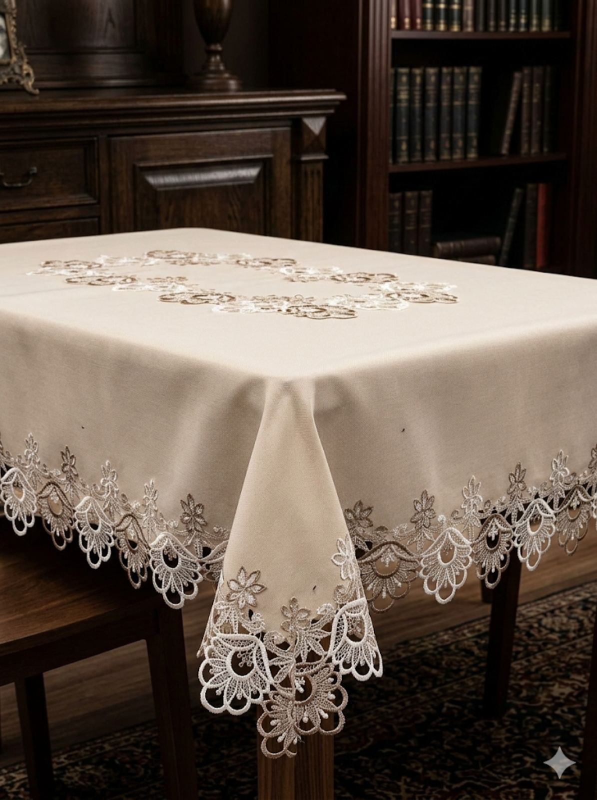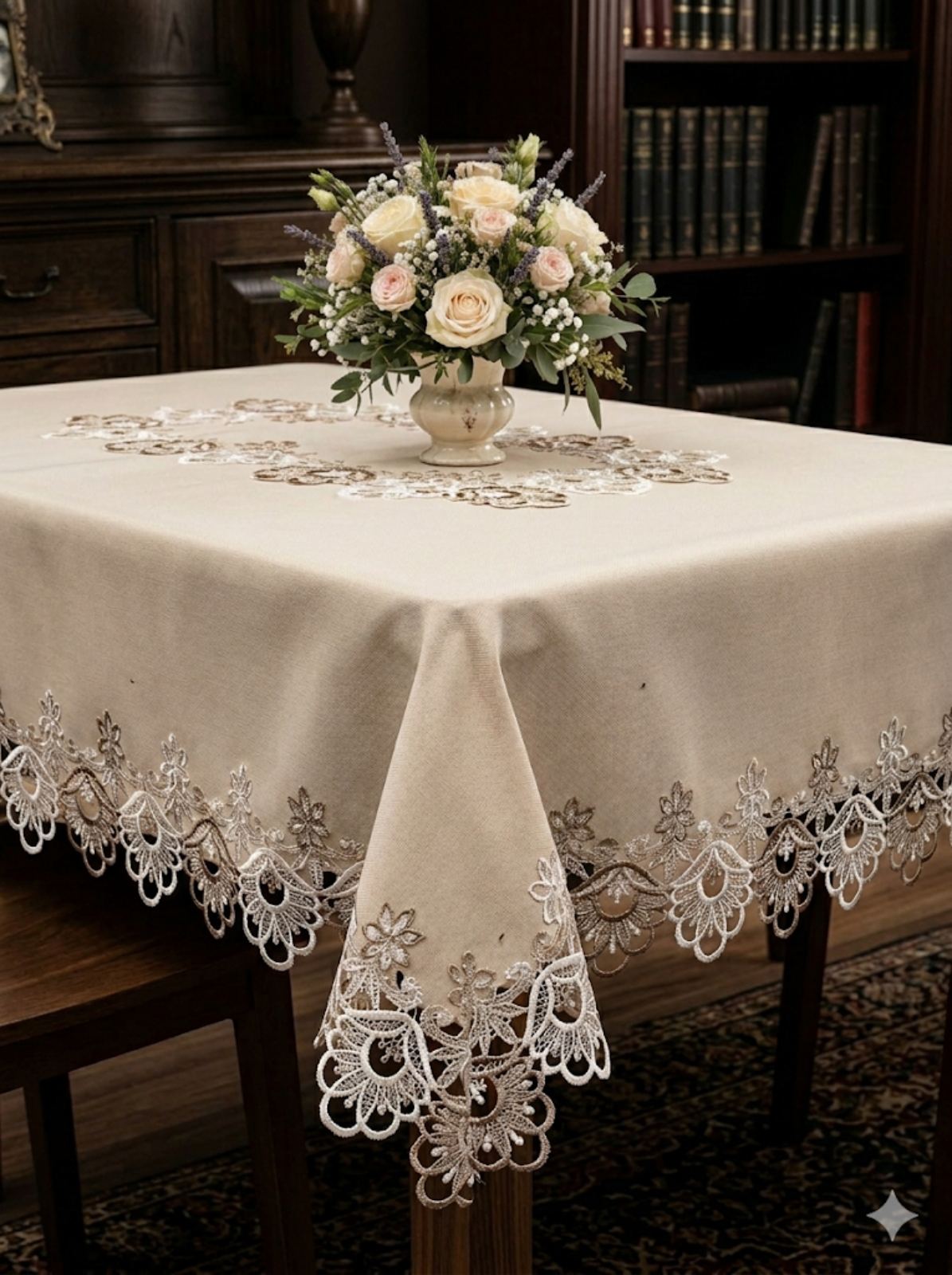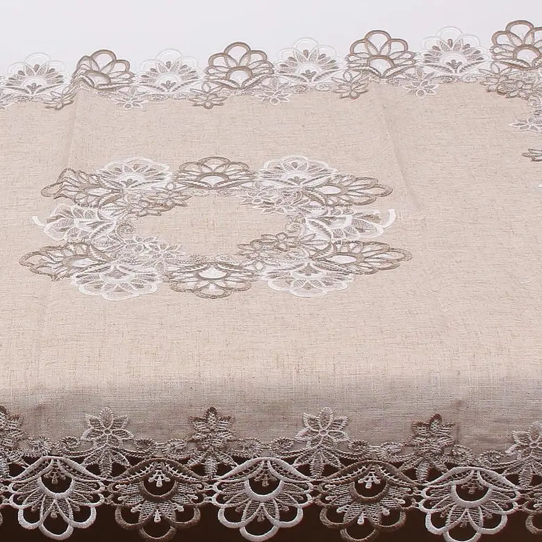 Покривка-каре в бежов цвят. От всички страни е обточена с плетена дантела на цветя в кафяво и бяло. В средата също. Стил и разкош за вашата трапезария.