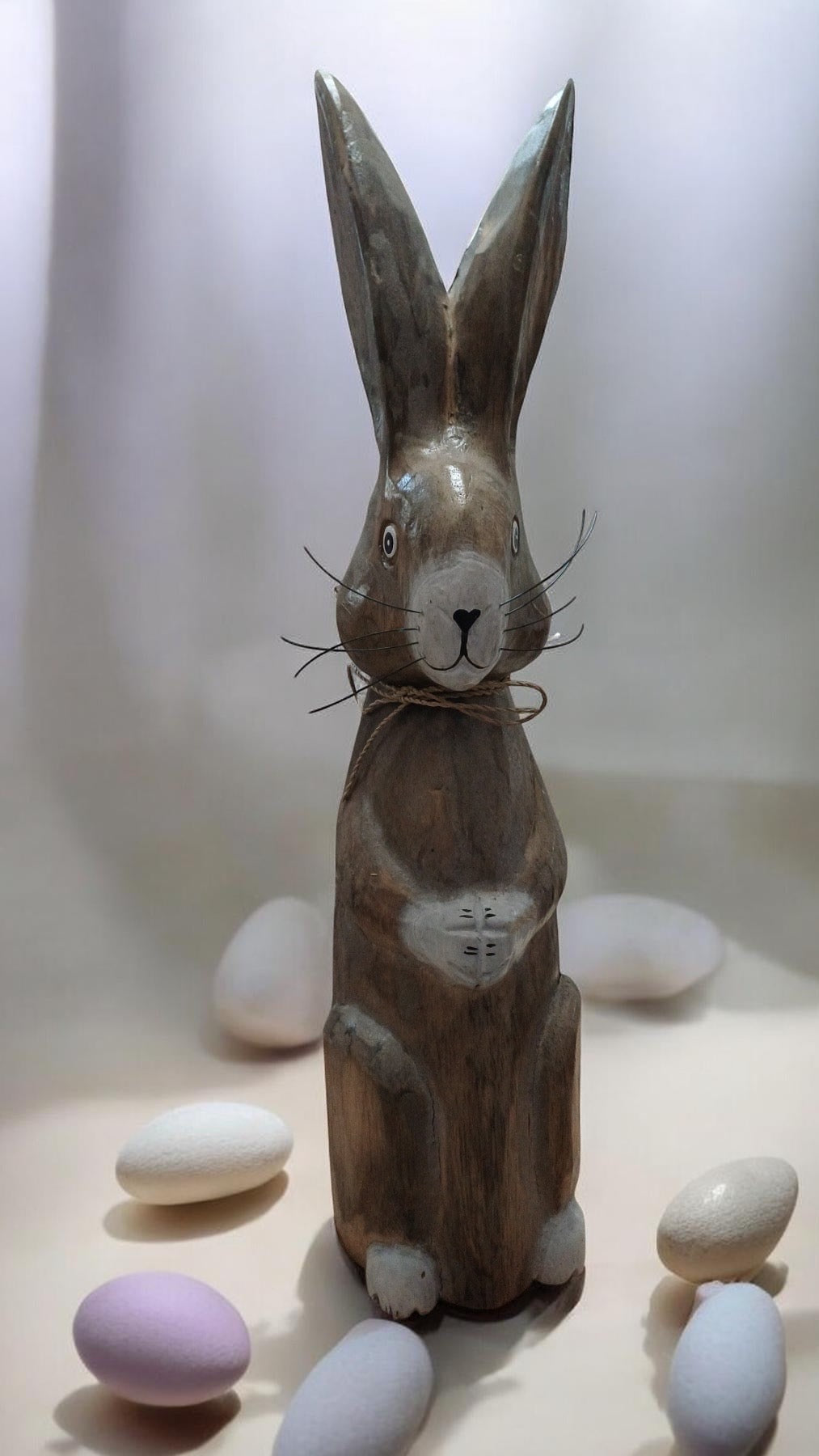 Тази очарователна фигурка представлява заек, изработен в рустикален стил. Изглежда е направен от дърво или материал с дървесна текстура (като полирезин), с добавени детайли като мустаци от тел и декоративна панделка от коноп. Размер: Н50/12: Н 40/10 Подарък за Великден