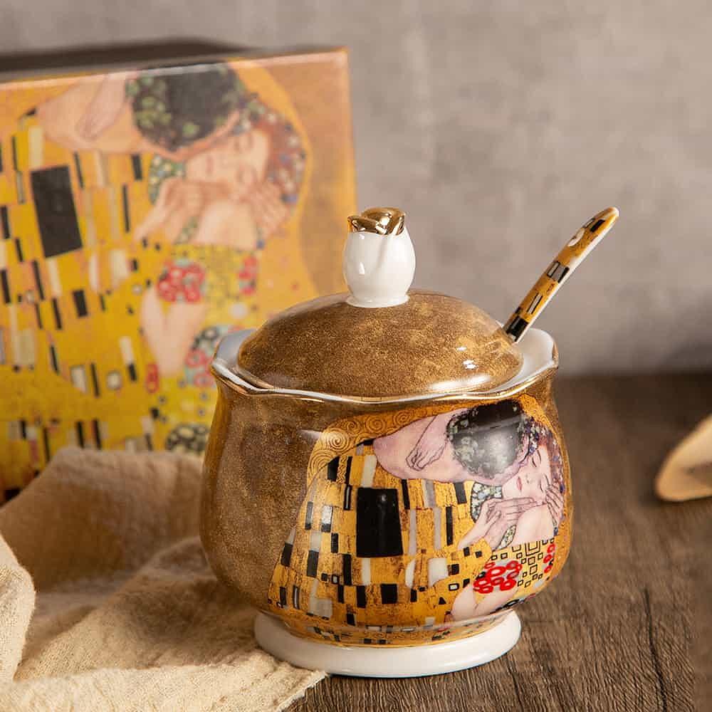 Захарница от серията "Целувката" на златен фон с порцеланово капаче и лъжичка. Декорът е репродукция на световно известната картина на австрийския художник Густав Климт. Предлага се в луксозна подаръчна кутия. Размер: 12x10x10 см. Материал: Порцелан.