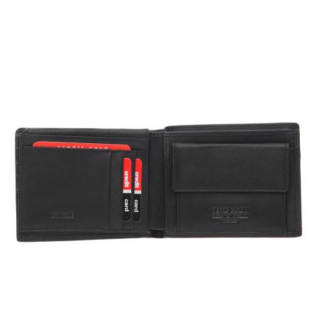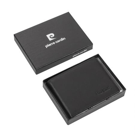 Мъжки портфейл Pierre Cardin, изработен от висококачествена естествена кожа, която гарантира дълготрайна употреба и изискан вид. Среден размер 11.5 x 10 см, той е достатъчно просторен, за да съхранява всички необходими документи, карти и банкноти, като в същото време остава компактен и удобен за носене във вътрешен джоб или сако. Семпъл и стилен дизайн в класически черен цвят, с фино релефно лого Pierre Cardin в долния десен ъгъл. Вътрешността предлага отделение за монети с капак, място за карти, включително прозрачна секция, и допълнителна клапа за повече практичност. Моделът е оборудван и с RFID защита, която предпазва личните данни на вашите карти.
