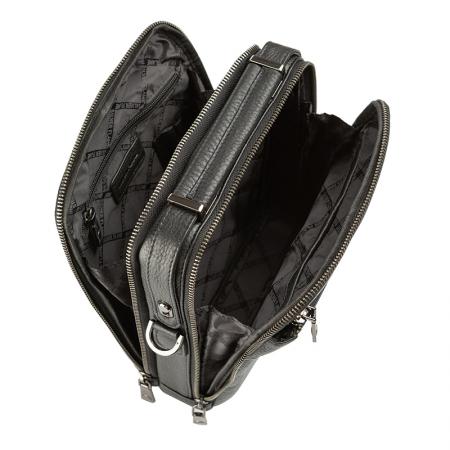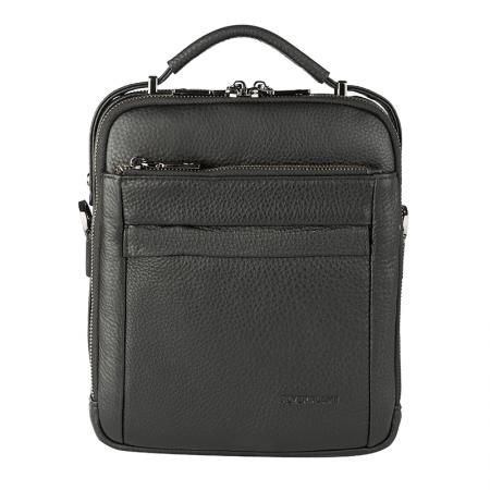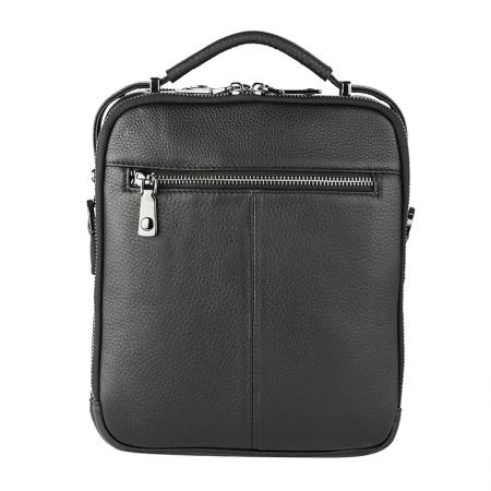 Елегантната вертикална мъжка чанта е изработена от черна, релефна естествена кожа с фина текстура и устойчив хардуер. Отпред има просторен плосък джоб и горен джоб с цип за бърз достъп до телефон, ключове и документи. Два основни отделa с ципове осигуряват отлично разпределение вътре – меката подплата и вътрешният джоб с цип държат вещите подредени. На гърба е добавен още един безопасен джоб с цип. Удобната горна дръжка позволява носене в ръка, а дългата регулируема презрамка превръща модела в удобна crossbody чанта за всеки ден – работа, пътуване или разходка.