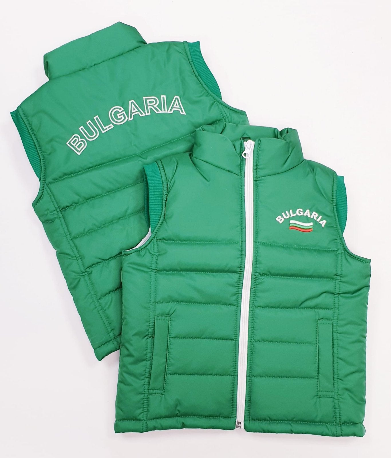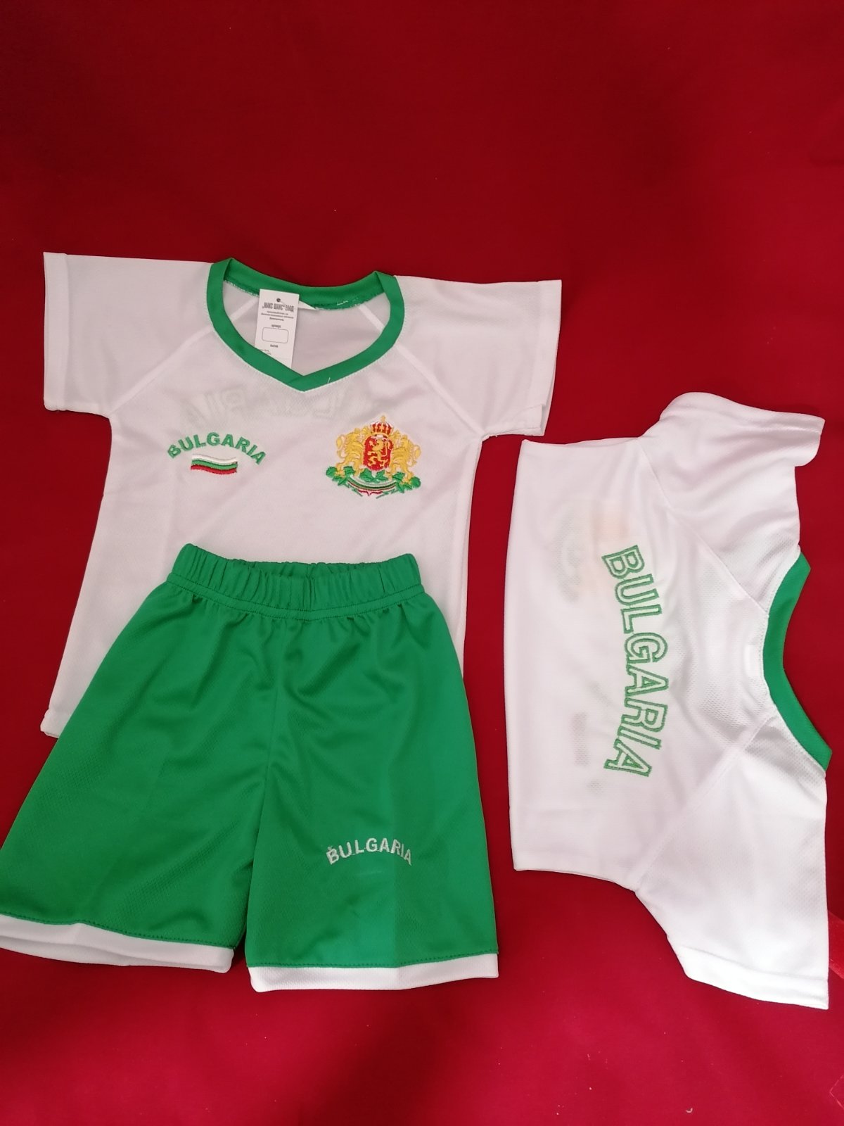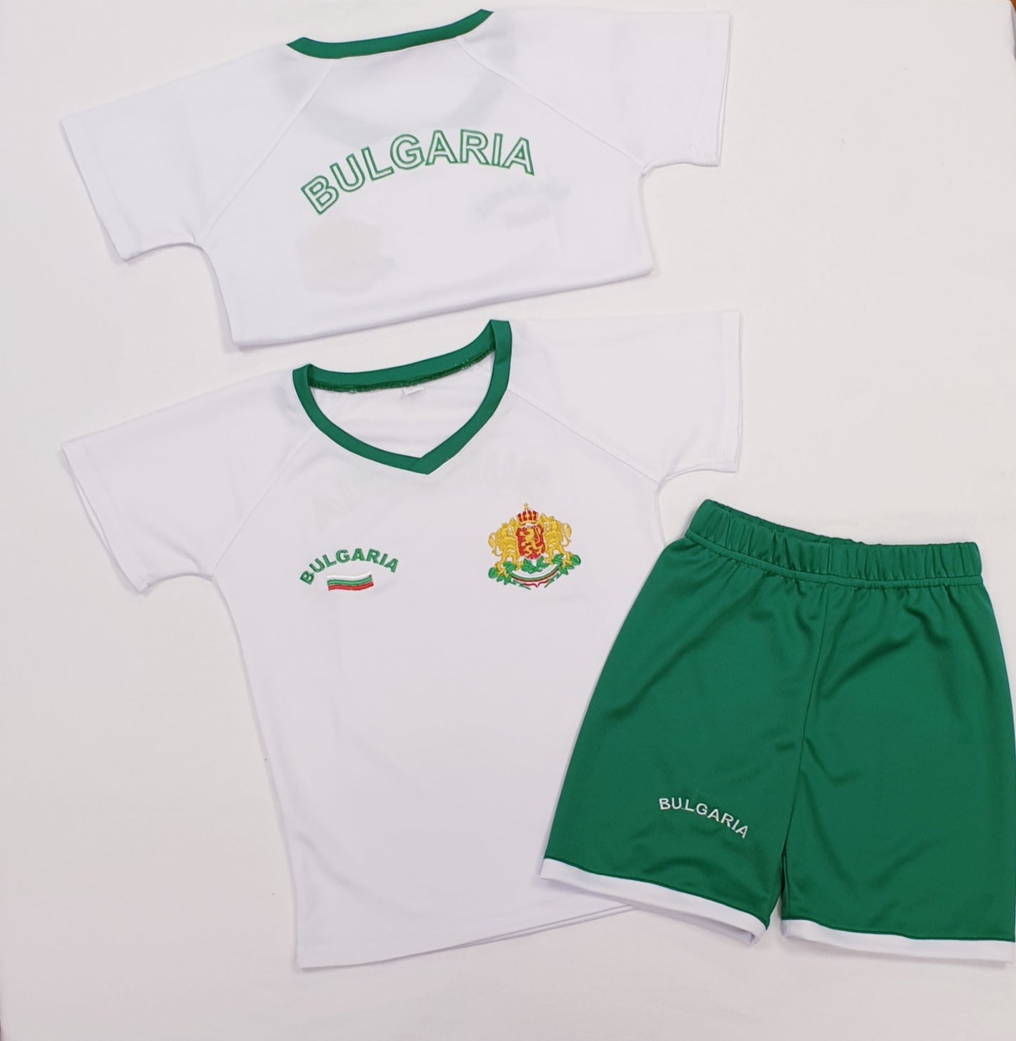 Детски спортен екип "БЪЛГАРИЯ" от две части-тениска с къси панталони. Тениската е с бродирана емблема, къс ръкав и шпиц деколте. Съставът е 100 % полиестер. Цената се променя спрямо размера !!! Произведено в България