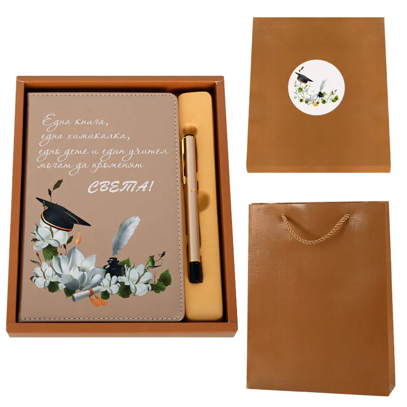 Луксозен комплект "Учител" с кожен бележник мелатен химикал в подаръчна кутия и опаковка.