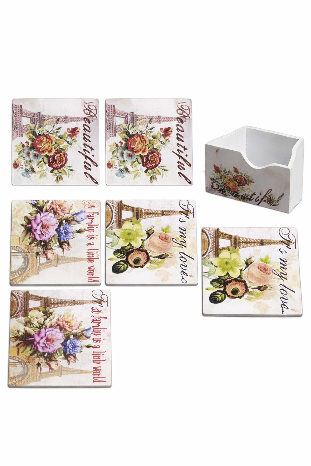 Подложки за чаши, изработени от МДФ с оригинален дизайн. Комплектът включва шест квадратни подложки с поставка. Размер на подложката 10х10 см Материал МДФ