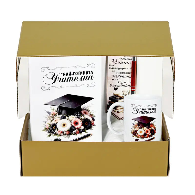 Подаръчен комплект "Най-готината учителка" с бележник, чаша, книгоразделител и химикал.