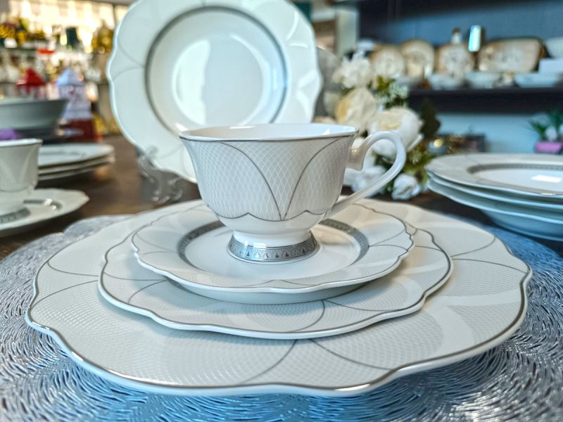 Комплектът за кафе или чай е изработен от NEW BONE CHINA /нов костен порцелан/ с нежна гравюра и сребърен кант от 12 части за 6 човека.