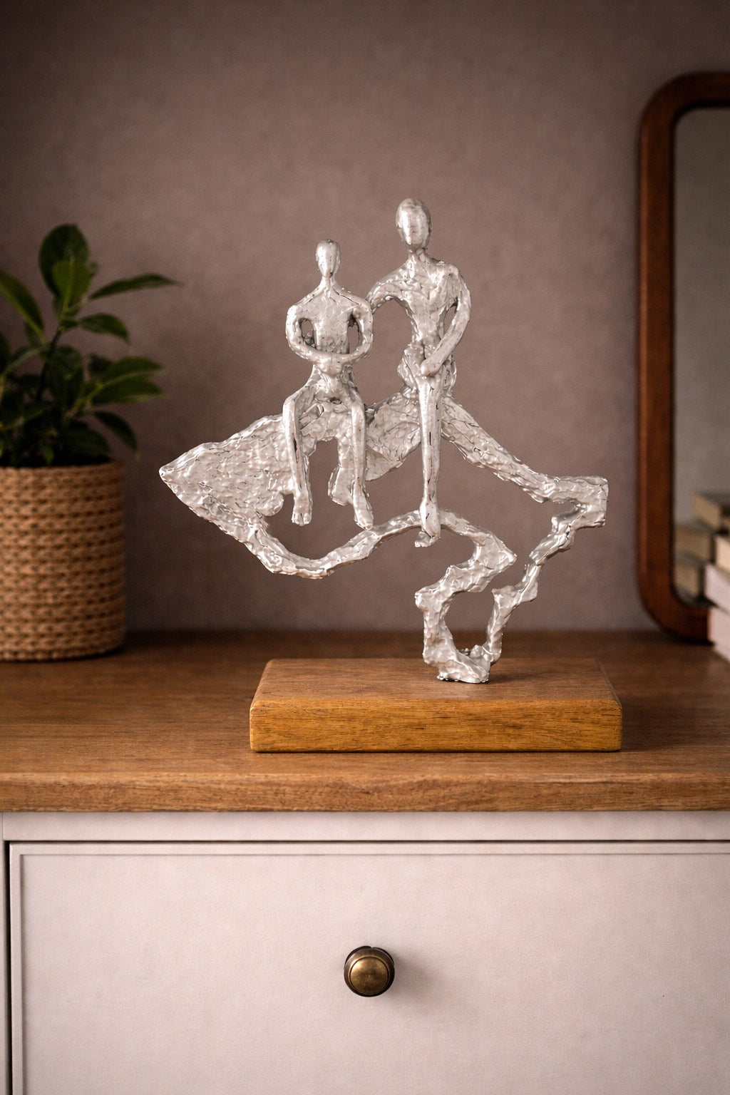 Елегантна абстрактна скулптура, изобразяваща две човешки фигури в момент на близост и баланс. Внушава усещане за движение, свързаност и спокойствие. Скулптурата е поставена върху стабилна дървена основа, която добавя топлина и завършеност на дизайна. Подходяща е за скрин, рафт, бюро или конзолна маса и се вписва отлично в модерен, минималистичен или скандинавски интериор. Идеален избор за подарък за нов дом, годишнина или специален повод. Размери: 29x10x38cm Подарък за сватба.
