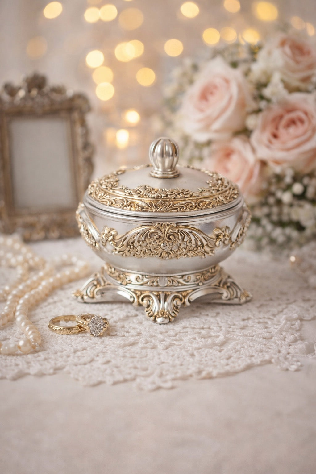 Добавете изискан акцент към своя дом с тази елегантна кутия за бижута, съчетаваща класическа красота и фина изработка. Богатите барокови орнаменти в сребристо и златисто придават усещане за лукс и стил, а изящните крачета и декоративната дръжка допълват аристократичния ѝ вид. Подходяща както за съхранение на пръстени, обеци, гривни и колиета, така и като впечатляваща декорация за скрин. Материал: полирезин Размери: 11.8x10.2x11.5cm