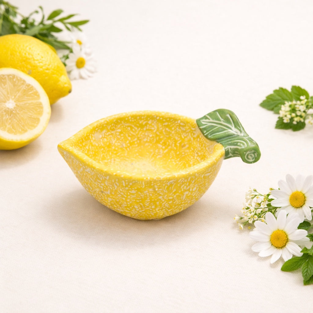 Стилна и оригинална керамична купичка във формата на лимон, която ще внесе настроение и свежест във всяка кухня. Подходяща е за сервиране на ядки, сосове, маслини, сладки или малки хапки. Дизайнът е ефектен и декоративен, а фините детайли и яркият жълт цвят я превръщат в чудесен акцент както за ежедневна употреба, така и за празнична трапеза. Размери: 15.5x11.5x7.5cm