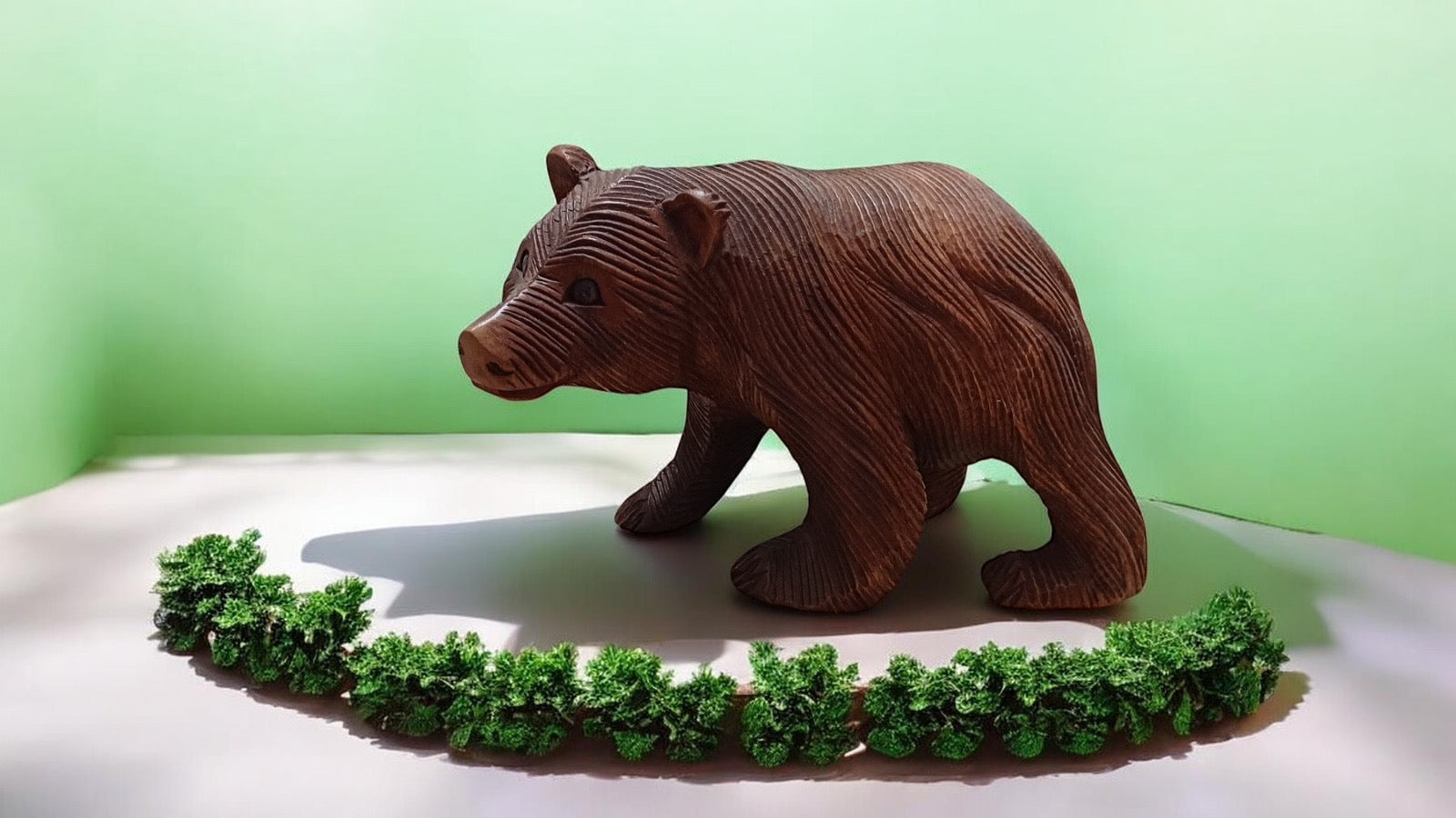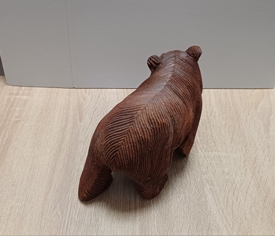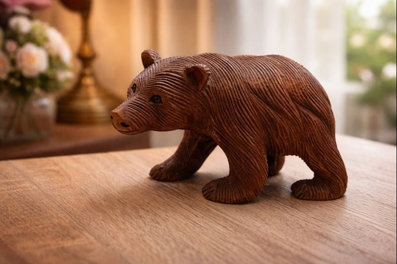 Ръчно изработена декоративна фигура на мечка, издълбана от масивно дърво с внимание към всеки детайл. Фините резки подчертават текстурата на козината и придават автентичен, естествен вид. Топлият кафяв тон и леко състареното покритие създават усещане за уют и връзка с природата.