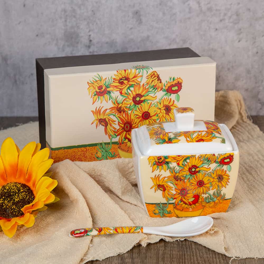 Захарница от серията "Слънчогледи" с порцеланово капаче и лъжичка. Декорът е репродукция на световно известната картина на холандския художник Винсент Ван Гог. Предлага се в луксозна подаръчна кутия.