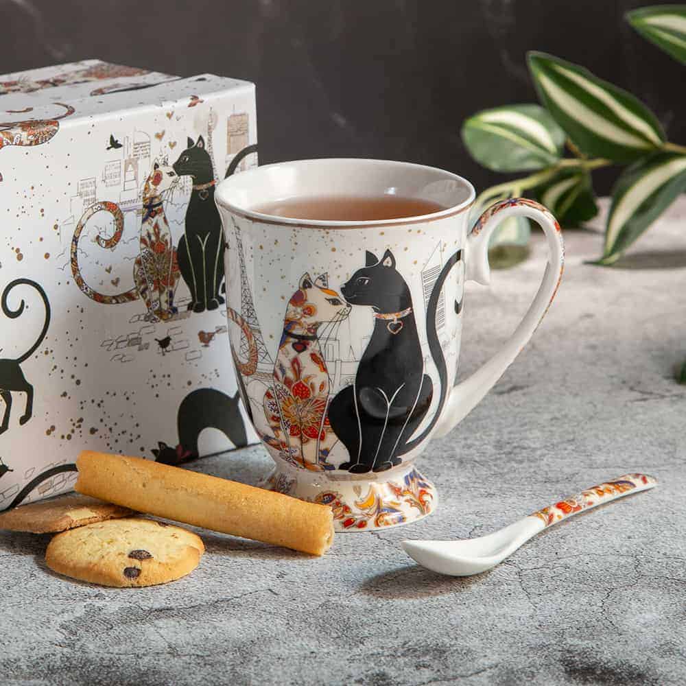 Подаръчна чаша от серията Котките с порцеланова лъжичка, елегантна форма и оригинален дизайн. Предлага се в луксозна кутия в същия дизайн.