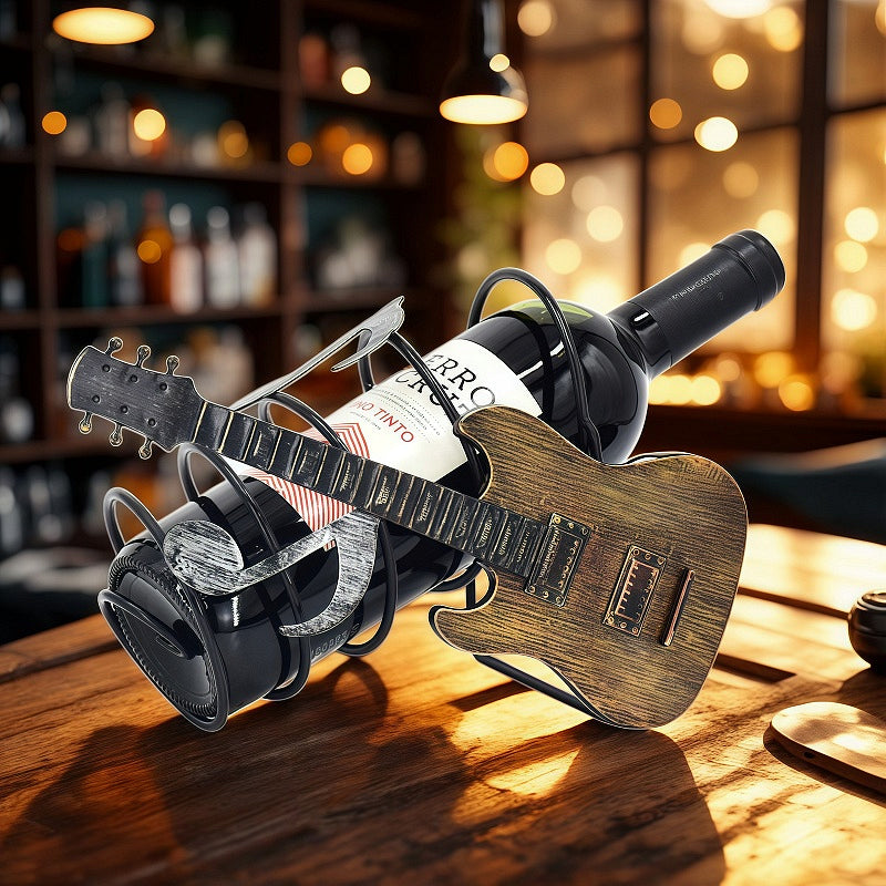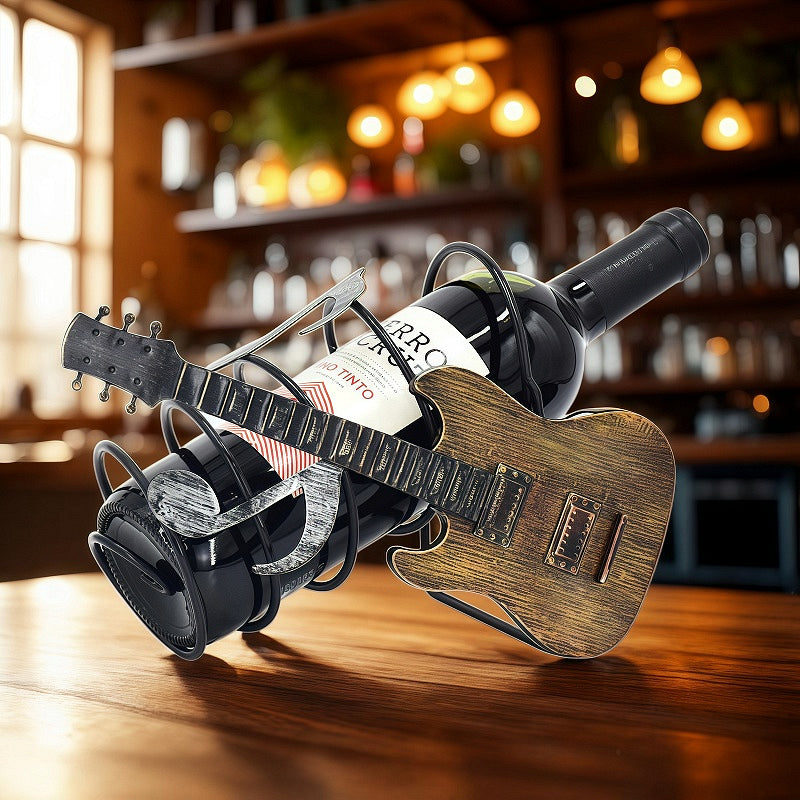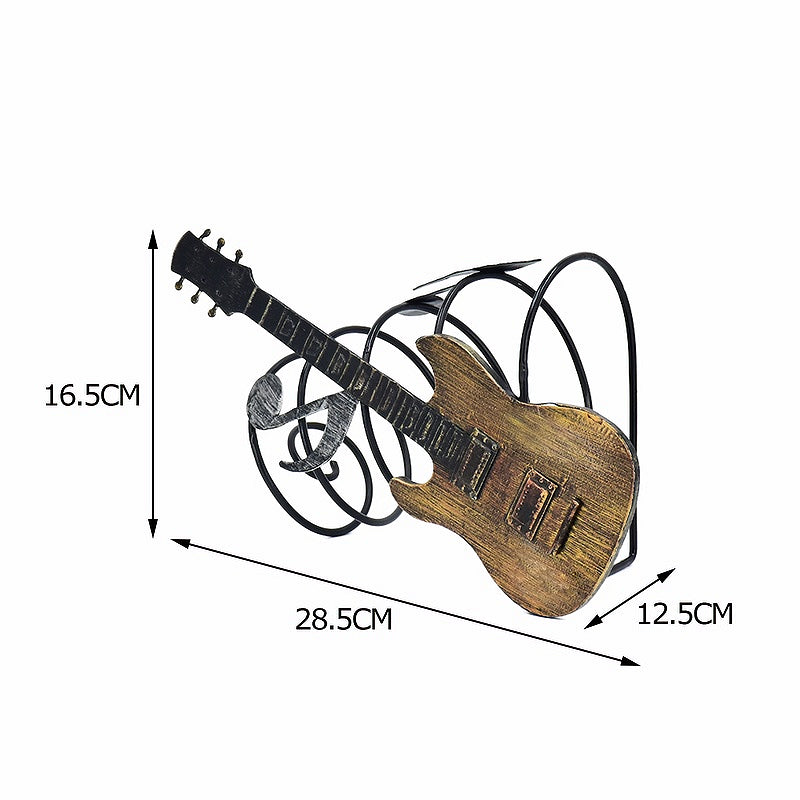 Стилна метална стойка за вино във формата на китара, допълнена с нота. Атрактивен и артистичен дизайн, който съчетава практичност и декорация. Перфектен подарък за меломани, музиканти и ценители на изкуството.  Любители на виното.Подарък за баща. Подарък за имен ден. Подарък за приятел. Подарък за рожден ден. Подарък за съпруг. Подарък за Трифон Зарезан. Поставки за вино. Сувенири за мъже. Подарък за заведение.