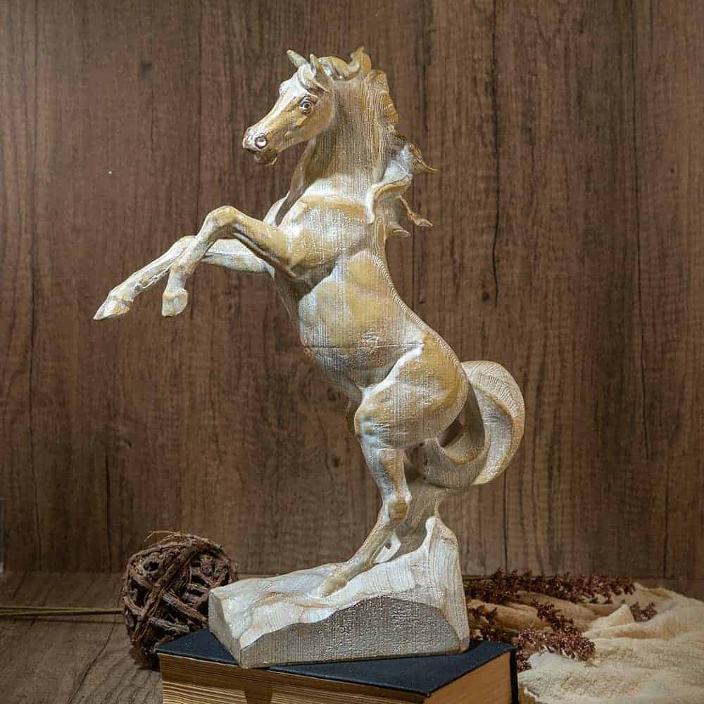 Декоративна статуетка кон изправен на задни крака. Величественият и благороден кон е символ на целеустременост, издръжливост и постоянство. Носи със себе си радост от живота и оптимизъм. Прабългарите са използвали опашка на кон за бойно знаме, превръщайки коня в символ на смелост, успех и сила. Мощен талисман в сферата на бизнеса и кариерата. Материал: Полирезин, размер: 40*30*10 см