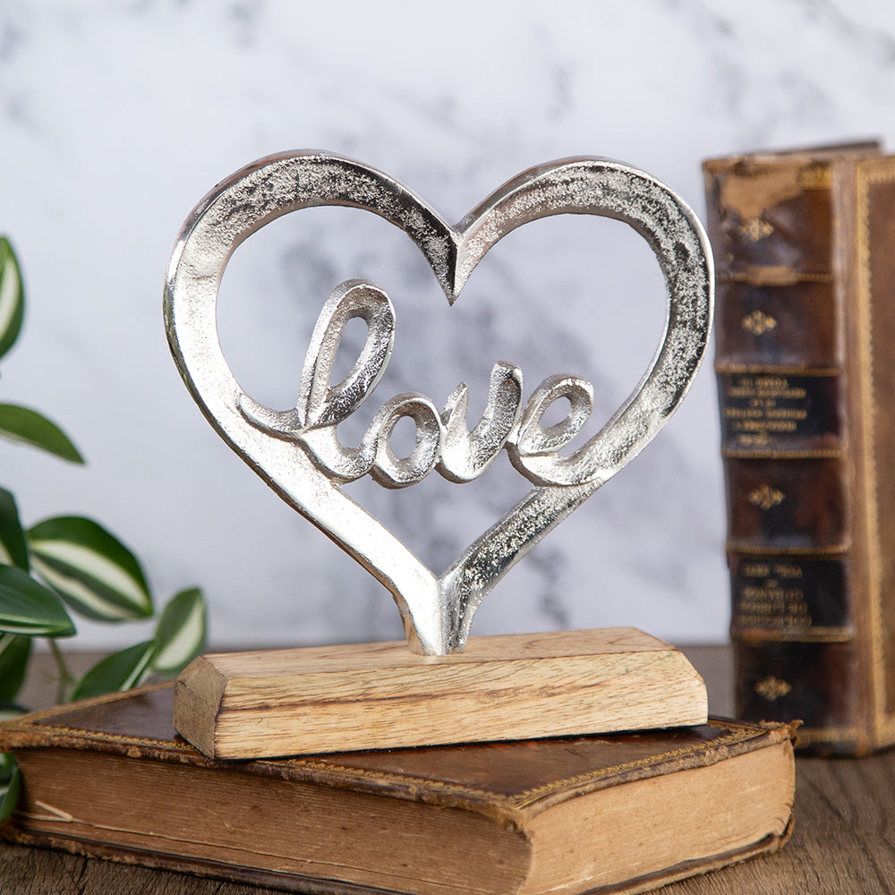 Тази статуетка съчетава два от най-силните символи на любовта – думата и сърцето – предавайки ясно и нежно послание.Тази статуетка е подходящ подарък за Свети Валентин, годишнина, сватба или просто като жест на внимание към любим човек. Тя може да добави топлина и романтично настроение в дома, като я поставите на видно място – на нощно шкафче, рафт или бюро. Материал: дърво, метал, размер: 16*14.5*5 см
