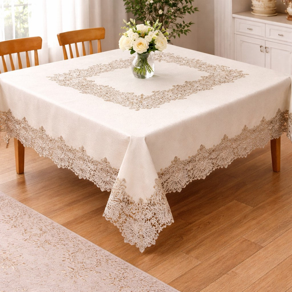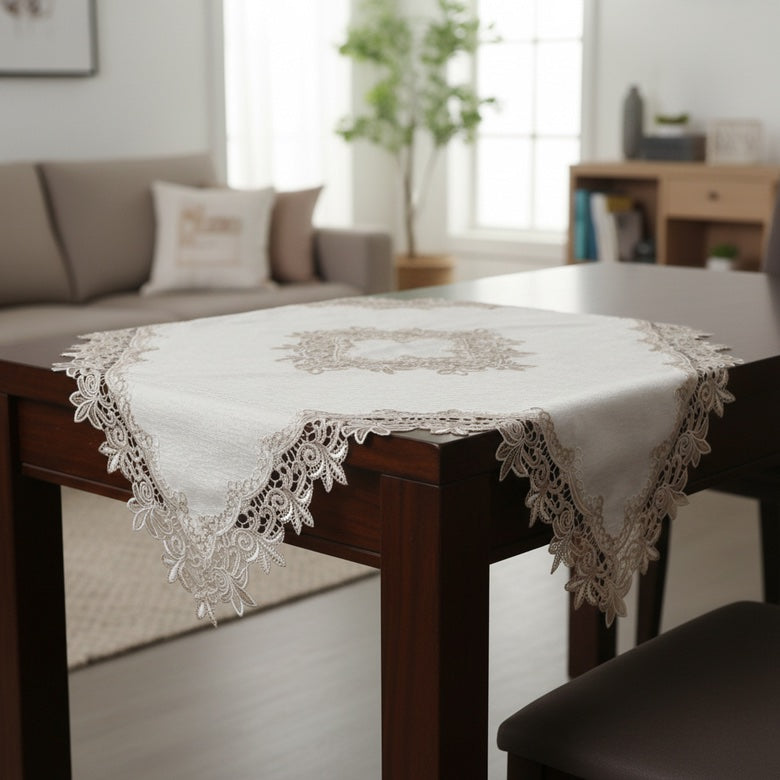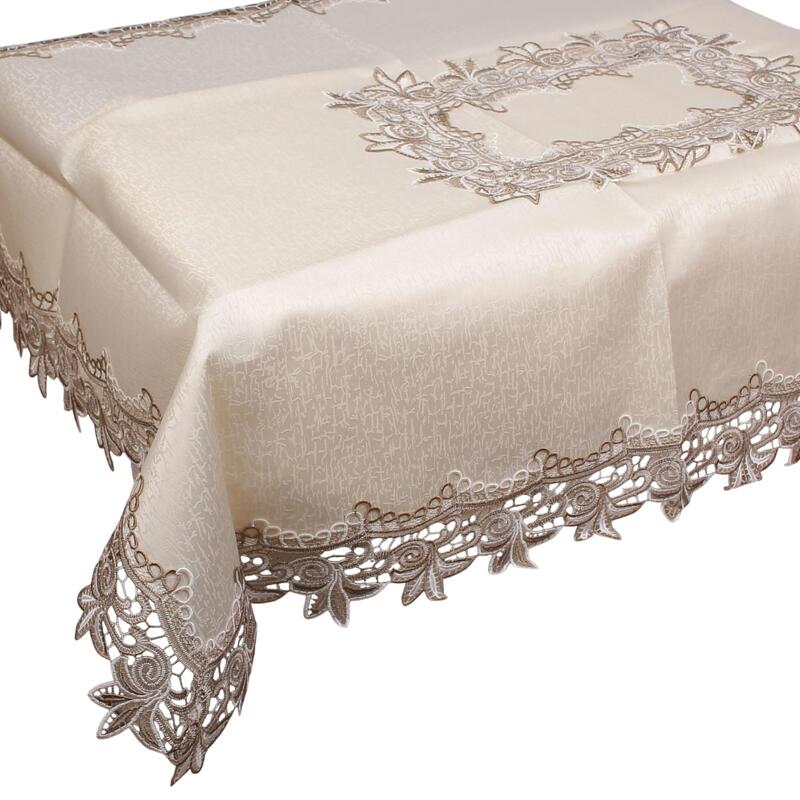 Прекрасна покривка за маса в бледобежов цвят. Отстрани има красива дантела от цветя в кафяв цвят. В средата също е декорирана с дантела от флорални мотиви. Изисканост и стил за вашия дом. Състав: 100% полиестер Подарък за жена. Подарък за нов дом.
