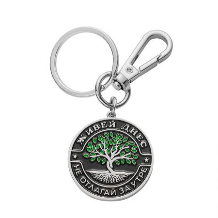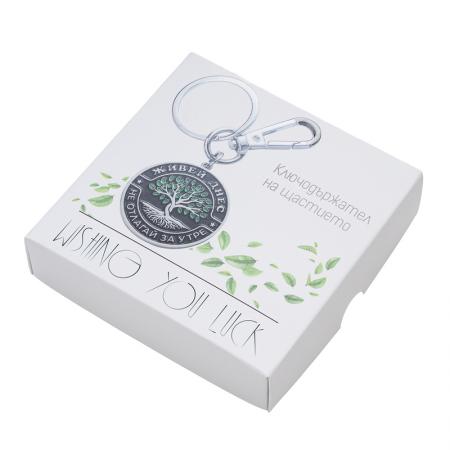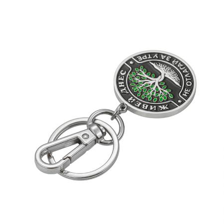 Елегантният ключодържател „Живей Днес“ е изработен от масивен метал със сребристо покритие и удобен карабинер за бързо закачане към колан, раница или чантичка. Към него е добавен класически разделителен пръстен за ключове и овален медальон в черно с контрастен бял символ и зелени акценти – стилизирано „Дърво на живота“ и текста „Живей днес – не отлагай за утре“. Изчистеният дизайн и стабилната конструкция го правят подходящ както за ежедневието, така и за стилен, практичен подарък.