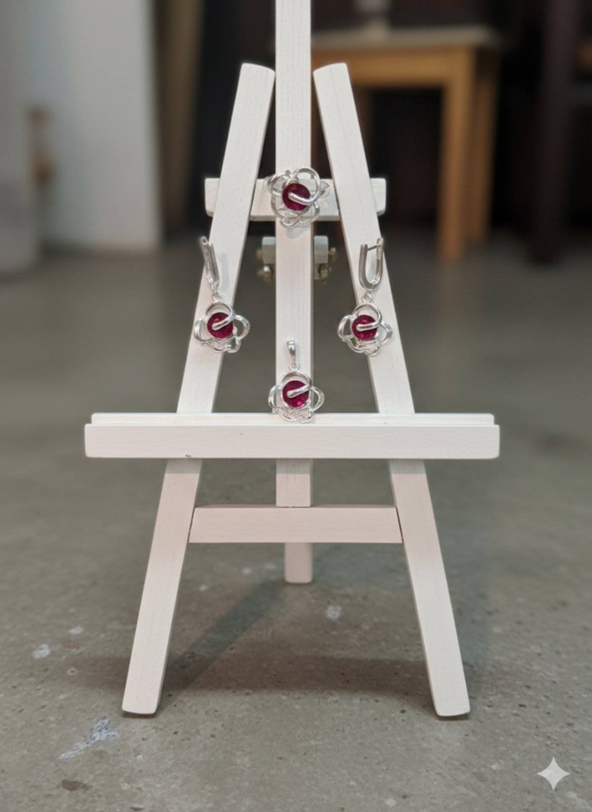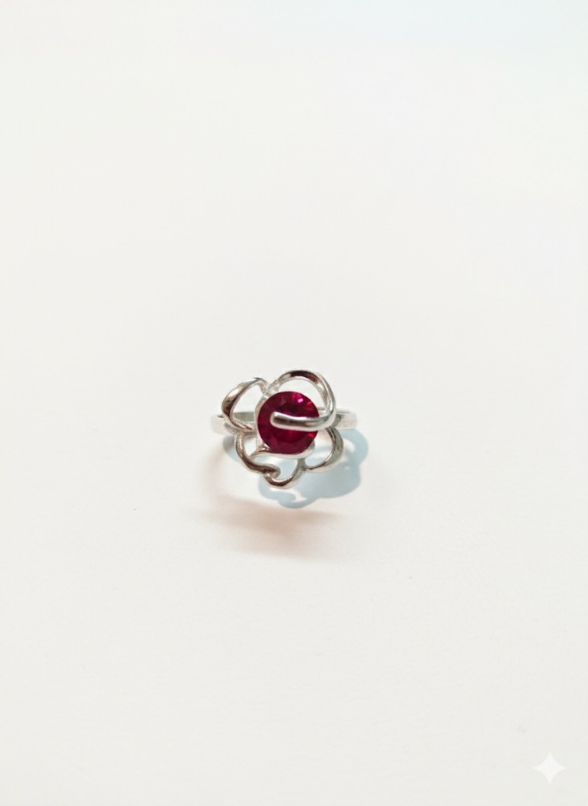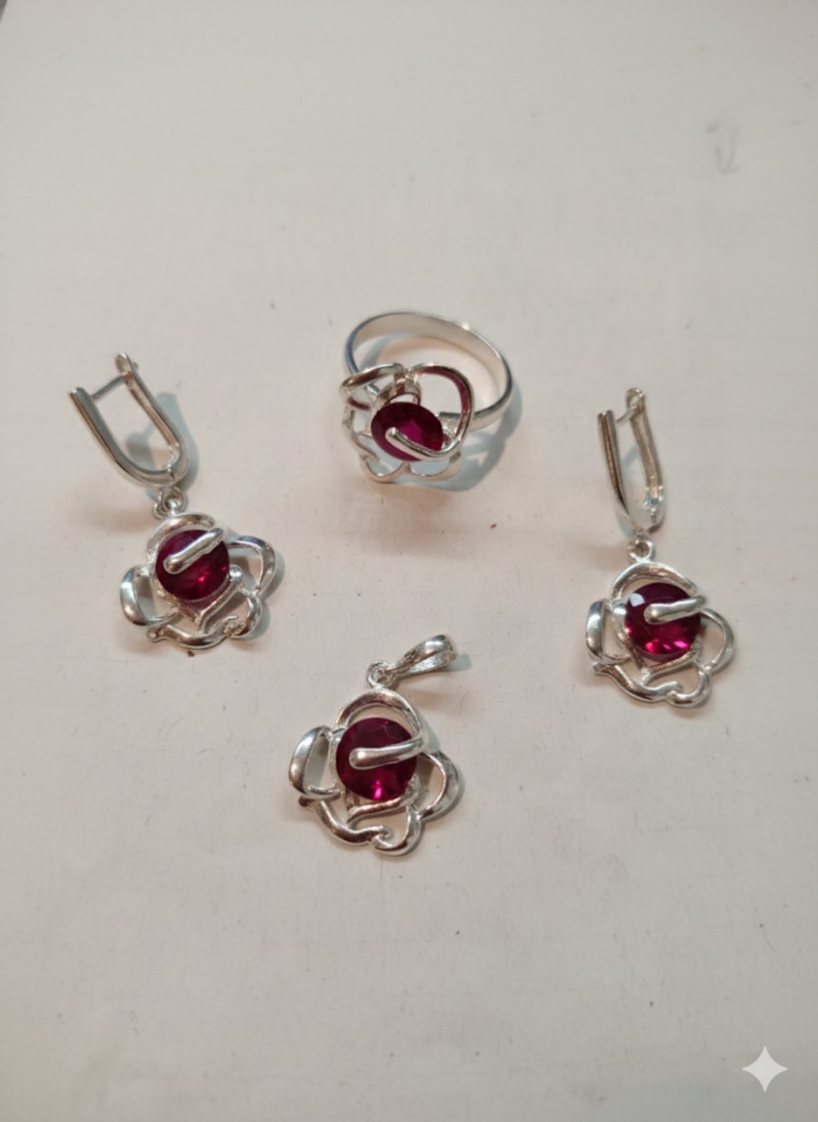 Всяко изделие се продава поотделно. За изработката на пръстена са нужни 10 дни ,ако нямаме наличен вашия размер. Произведено в България. Обиците са с английско закопчаване. Бижуто може да се изработи в различни цветове. Камъка е с размер 8мм. - синтетичен рубин.
